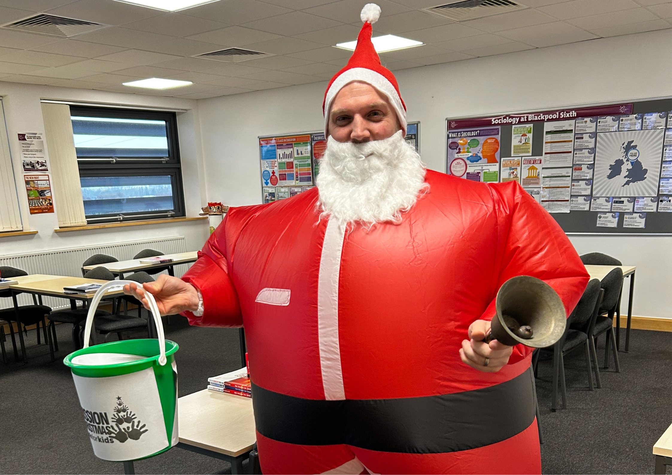 Alongside the mountain of donated gifts, the Social Science team also brought plenty of festive fun. Each year, one staff member embraces the season with a different costume, from elves and the Grinch to this year’s unforgettable inflatable Santa. This cheerful fundraising helped raise over £300 in cash donations, allowing the team to buy gifts for age groups where there were shortages.