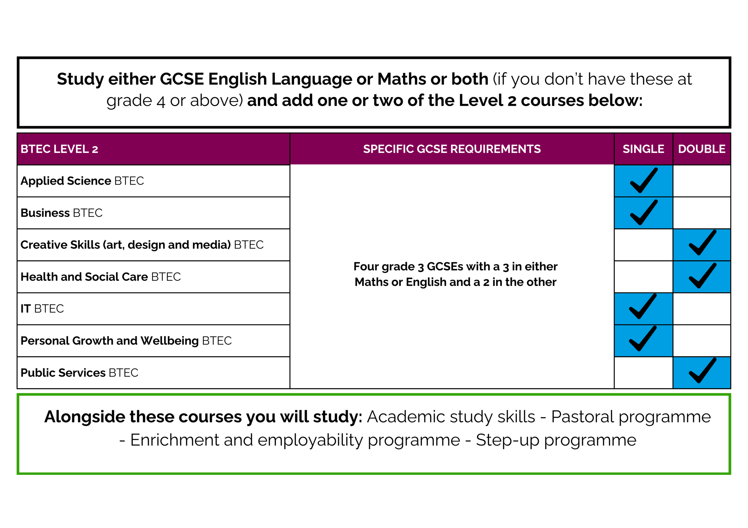 Students will study 3 or 4 level 2 subjects (including English and/or maths as required) alongside academic study skills, pastoral, enrichment and employability programmes and the end of year step-up programme. This range of programmes is designed to prepare you effectively for the step up to level 3 study, ensuring you are best placed to gain the most from your time at college before progressing to either university, into an apprenticeship or employment.