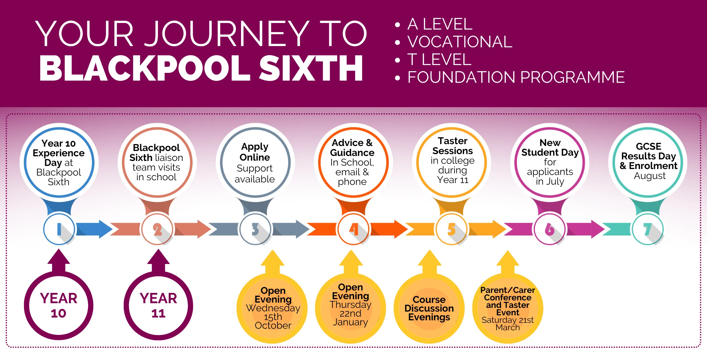 Preparing to start college is exciting, but there is a lot to take in at the same time. We are here to ensure your transition from school to Blackpool Sixth is straightforward and easy to follow, from Year 10 Experience Day to Results and Enrolment Day. This page will give you an overview of the process and helpful links to relevant information. If you cannot find what you are looking for, do not hesitate to contact our admissions team at admissions@blackpoolsixth.ac.uk.